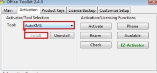 2、进入Microsoft Toolkit设置界后,点击Activation 选项卡下面选择要安装一个AutoKMS如下图所示操作。
