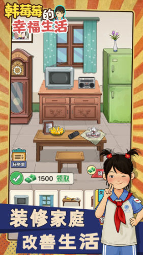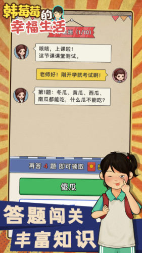 韩莓莓的幸福生活,一款趣味答题游戏,玩法和王蓝莓游戏类似,这里主角是可爱小女孩韩莓莓,挑战各种答题赚收益,改善家庭生活,装修家居,提升生活幸福度。