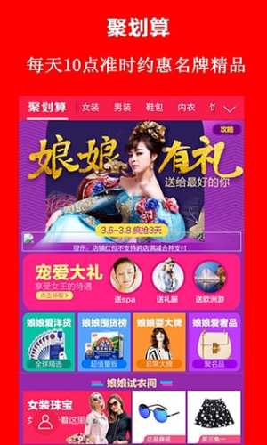 3、聚划算,团购老品牌,每天早10点上新商品, 覆盖女装、男装、母婴等多个类目,以及热卖品牌、进口精品、超值囤货等多种特色商品及市场;