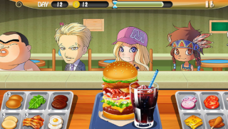 游戏开始的时候玩家只有一个很惨的的小店,寥寥的几个食物配方,研究更多的美食配方,将自己的汉堡推广出去;