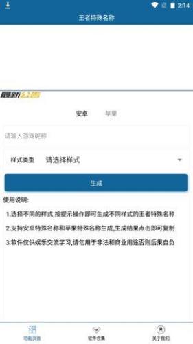 王者特殊名称生成器是一款能为王者玩家生成各种特殊符号的软件,生成成功后,玩家就可以直接复制试用啦,非常方便,感兴趣的小伙伴快来下载吧。