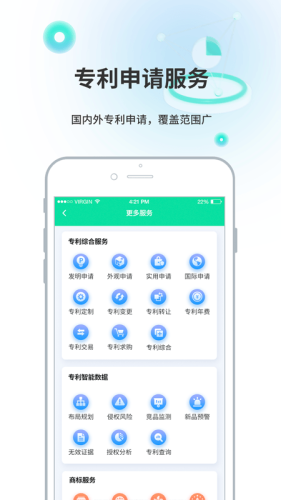 3、专利服务,提供专利无效、专利答复审查意见、专利评估、专利转让、专利变更、证书补班等相关服务。