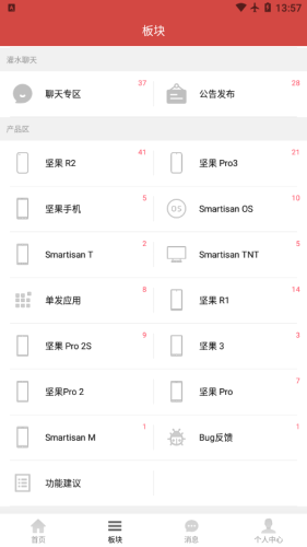 其中,产品区按机型分为各种论坛版块,几乎包含锤子科技目前所发布的所有机型。用户可以在此自由的交流和讨论。