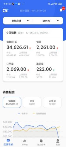 3、店铺看板:该页面展示店铺维度的及时销售数据,包括但不限于今日、昨日、上周同日的销量、销售额、订单量、退货量等信息,以及不同数据对比的折线图;用户可根据店铺、日期范围对于展示的数据进行筛选