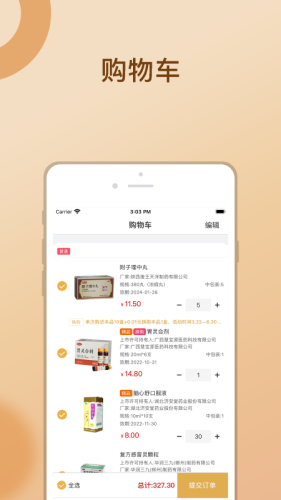 3.对于用户有购买使用需求的商品,可以添加到自己的购物车当中,进行合并支付可以让用户享受到更多的跨店满减优惠,非常的实惠便利。