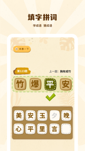 2.创新双模式:书山有路为关卡通关模式,循序渐进方能通达人世。学海无涯为无尽游戏模式,学海虽无涯仍需勤勉行舟。在获得紧张刺激的游戏体验的同时丰富你的成语词库。