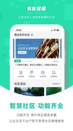 有你智居app,智慧社区生活平台,提供多种便捷服务,发布最新动态信息,发现最新社区活动,居民在线互动,享受更便捷、更省心的智慧社区生活。