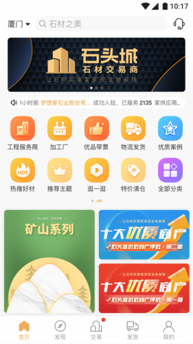 石头城app是一款优质石材工艺品采购平台,能够为用户提供相关资讯、加工厂、采购、服务商、物流货运、款项收付等一站式服务,帮助你选购需要的材料。