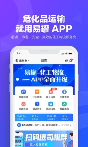 易罐app是一款危险品物流行业服务平台,平台拥有海量车源货源,可以在线聊天沟通,可以查看政策资讯等等,平台实名认证,安全稳定,需要的朋友欢迎前来下载使用。