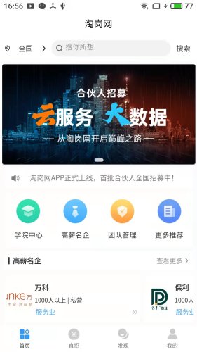 淘岗网app是一款专业的求职招聘软件。软件是祝丰达旗下专注于人力资源大数据服务的APP、祝丰达拥有18年的行业从业经验,通过淘岗网能有效解决企业用工、用户找工作等刚需的痛点。