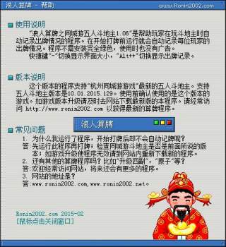 浪人算牌之同城游五人斗地主是由浪人算牌器官方推出的专门针对同城游五人斗地主的算牌器,这款软件拥有记牌、算牌功能,浪人算牌程序内没有广告,无需安装,解压缩即可使用;安全软件的防火墙设置要允许,否则无法登录。欢迎免费下载使用!