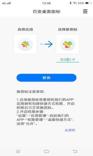 1.应用换图标需要授权我们的APP应用拥有创建快捷方式权限,开启权限后可正常换图标。