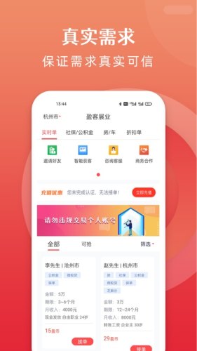 盈客展业App,助广大信贷经理赢在先机,提供了一手资源、轻松获客,自动推荐等服务,真实需求保证真实可信,每天海量新单,需求源源不断。