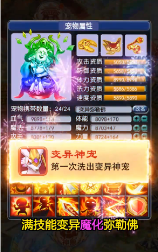 2、10M放置西游,无限金柳露,极品BB技能全红。