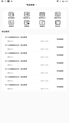 1、在软件中,有为用户提供的多项的日常学习模式,包括但不限于每日推荐、随机练习、顺序练习、模拟考试、或者是考试笔记等等的学习内容;