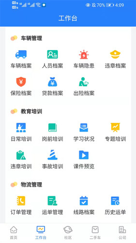 运输企业交流社区、新车、二手货车、安全例会、隐患治理、待办提醒、物流管理、财务管理行业文档、安全达标、双重预防等功能。