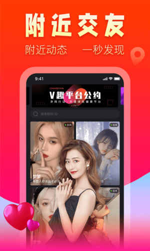 V趣app,语音视频社交软件,一键查看附近小哥哥、小姐姐,在线聊天互动,随时沟通交流,发表个人观点,认识更多志趣相投好友,享受更多聊天乐趣,交友更轻松。