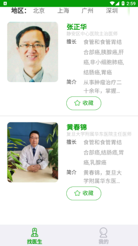 用户可在app中查找癌症领域的知名专家、工作在抗癌一线的著名医生,以方便了解医生情况,从而在线下的正规医院找到快速找准对症的好医生,及时治疗,早日康复。