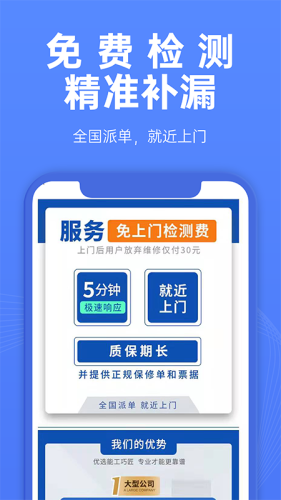 啄木鸟防水补漏app是一款专业的房屋维修神器。软件为用户提供了专业的房屋防水补漏维修,适用于多种房屋,用户只需在软件内下单,马上会有专业的人员进行接单,并快速制定出详细的方案,维修更便捷。