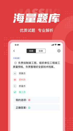 施工员考试聚题库app是一款非常好用的题库软件,它的页面简洁,功能强大, 能够帮助用户高效备考学习,APP里的题目都是近年来的真题,包含了很多的模拟考试,让用户快速掌握重难点,欢迎大家下载体验。