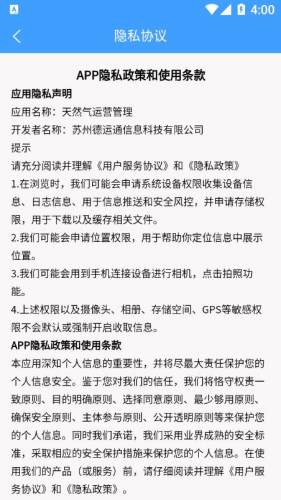 该应用由苏州德运通信息科技有限公司开发所有,主要为燃气行业提供信息化运营管理,给相关人员提供专业、有效的数据和报表统计功能。系统包含:采购管理、运输管理、销售管理、贸易管理、物联网、智能调度、挂牌价等模块,大大提高了工作效率,节约了人工成本。