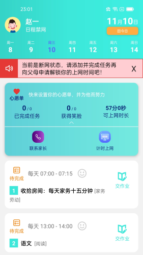 爱菠萝守护孩子端app是一款孩子成长管理服务软件,使用方法简单,可以制定不同的任务,获取任务来完成,通过多方面数据,了解自己上网时长,并且可以查看获得笑脸个数,除此之外,还有奖励和心愿,需要伙伴,即可健康成长。