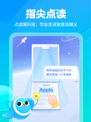 「指尖点读」及 「指尖查词」:用户用手指着书本上的单词或文字,即可显示所指内容的意思和读音。