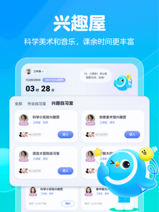 【在线自习室】:种类多样,涵盖作业自习室和兴趣自习室。作业自习室让学生沉浸自习,帮助提高学生做作业的效率。兴趣自习室涵盖科学、美术和阅读,全面覆盖学生的兴趣需求。自习全程有老师和同学陪伴,逐渐提高学生自主学习的能力。