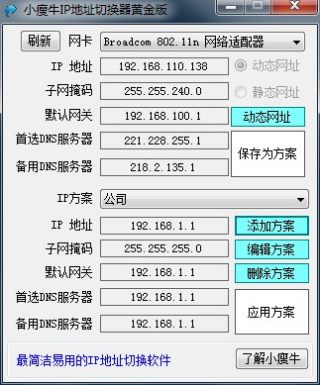 简约,易用是黄金版的主要特点,功能全部集中于单界面便于您的操作。程序内核进行了多层次的优化,运行快速。通过新建多个IP配置方案,需要时可方便地将方案应用于指定的网卡,亦可对方案进行修改、删除,整体功能非常人行化。