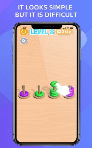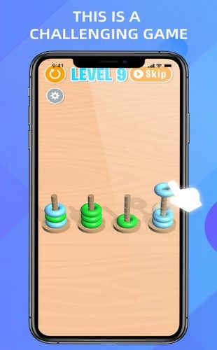 铁圈颜色排序是一款休闲益智小游戏,在游戏中没有复杂的操作方式,玩家进入游戏后会出现杂乱无章的铁圈,你的任务很简单,只需要将相同颜色的圈圈放在同一根柱子上就行了。游戏玩法轻松,操作简单,就是要动动脑子,快来下载试试吧。