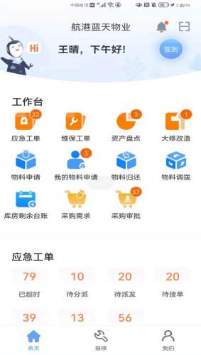 蓝天物业App是以提高物业运维工作效率和管理效能为基础的物业管理工具,提供了日常物业人员的签到管理、应急工单、维护保养、知识库、库房备品备件出入库管理等功能的应用工具。
