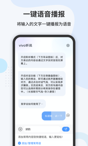 vivo听说app,手机文字转语音工具,功能齐全,精准识别,一键转语音,操作更便捷,让沟通更轻松。来vivo听说app,支持文字转语音、文字播报等功能,让沟通无障碍。