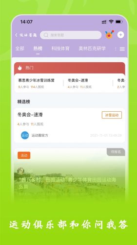 主要包括青少年活动、体育故事、精彩视频、运动俱乐部和你问我答。