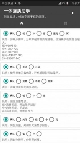 一休画质修改器1.7是一款专门针对喜欢吃鸡游戏的爱好者打造的app,并且使画质变得更加高清精美起来,操作体验感是极好的,更能够对每一个参数进行调节,使用户在游戏世界中快速获胜并且拥有更流畅的操作手感,还为用户提供了一键设定功能。