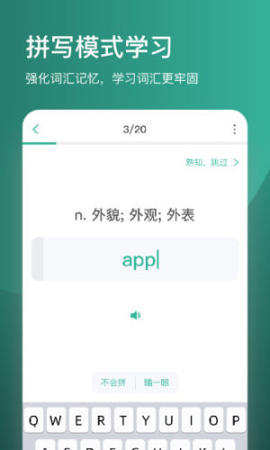 - 支持拼写提示、熟知跳过、生词本和错题本,同步到学习页面,学习更高效。