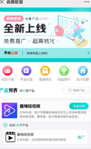 选择一款产品,然后点击【推广】,进入之后先不要着急,先到腾讯视频里面找到一个你想分享的视频,然后复制其链接地址,再回到疯推联盟,将链接地址粘贴进去,然后选择一个标题,这标题都是带有引导性的,然后备注一下作品,接着开始转换链接,然后发到你的视频号,如果有人点击你引导语那里,你就可以赚取广告佣金,也就是相当于赚了一个点击阅读量。