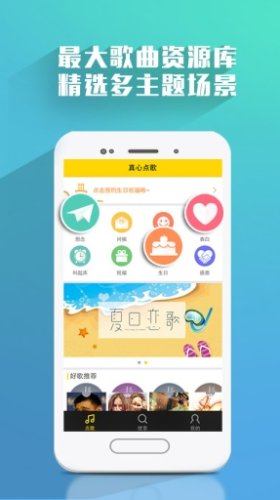真心点歌台安卓版,独家发布电话点歌,好友手机接听;最大歌曲资源库,精选多主体场景;明星坐镇献声音,祝福说话备有面;使用真心点歌客户端,生日祝福好管家,好友生日永不落;点送接收全记录,留下每一份感动。