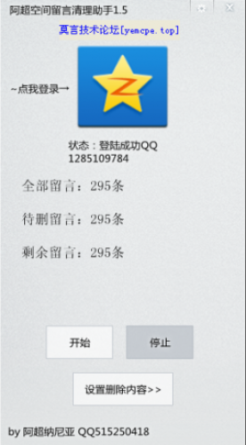 今天小编为大家带来一款阿超空间留言清理助手,这款QQ空间留言清理助手支持QQ快速登陆功能,启动后点击QQ空间图标即可弹出快速登陆界面,支持本机检测与QQ号码输入。登陆成功后自动获取留言信息,比如:全部留言、待删留言、剩余留言。界面也非常的精美。请大家下载使用吧!