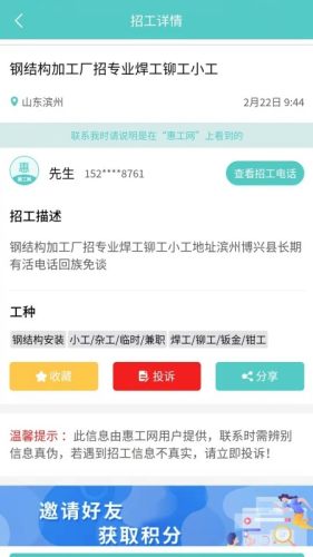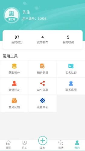 惠工网App,是一款招工找活平台,提供了建筑招工、装修招工、焊工招工、工厂招工、助农振兴、招聘司机、实名查询等功能,邀请好友获取积分,无上限,每成功邀请一名新用户,可获得1-20积分。
