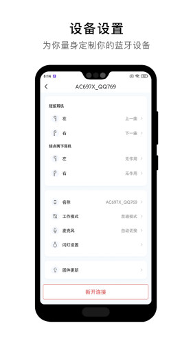 耳机功能设置(耳机快捷操作的指令设置,设备OTA固件升级,工作模式选择,设备重命名,耳机麦克风喜好设置)。