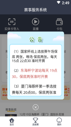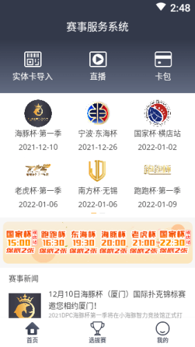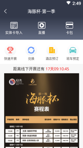 中趣赛事服务安卓版为您提供专业的赛事资讯内容,您可以在这里查看各类比赛的最新比赛世界,方便您及时的预约观看视频直播,此外还有实体卡导入和卡包功能等你来体验!