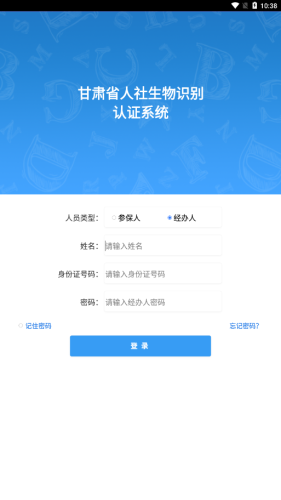 1、打开甘肃人社认证APP→人员类型选择参保人→输入姓名+身份证号码→点击“登录”按钮完成登录。