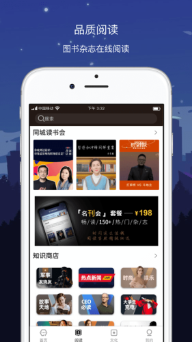客户端有知识服务、文化服务、生活服务三大板块组成;