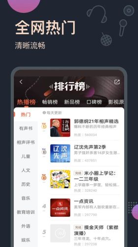 全网有声资源任你点播!单田方评书大全、张震讲鬼故事、刘德华怀旧金曲、易中天品三国、蕊希电台、郭德纲相声全集等各类有声资源,带您体验正版精品、优质经典的免费听书魅力!