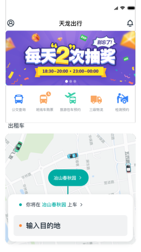 “天龙出行”App为用户提供了线上打车的功能,改变传统出租司机等客方式,从打车初始阶段到下车使用线上支付车费,最大限度优化乘客打车体验。