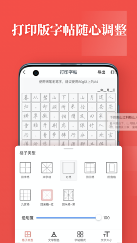 【个性化设置】可设置格子样式、文字透明度、格子透明度、字帖背景主题等。