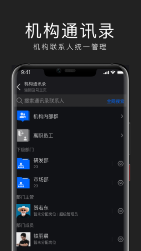按组织架构查看机构成员信息,获取部门主管、部人员岗位、人员联系方式。