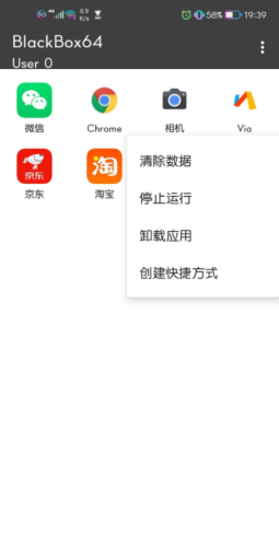 2. 长按某图标即可弹出菜单,“创建快捷方式”需在blackbox应用权限中给予允许打开的权限;空白处由左往右滑动即可重复克(duo)隆(kai)应用,原则上无限制;