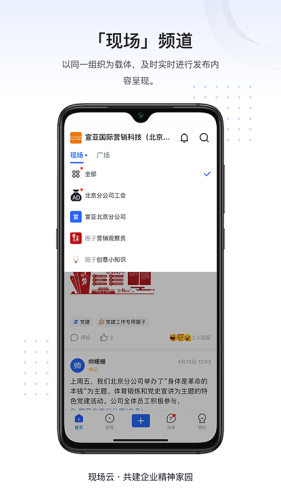 【”现场“频道】以同一组织为载体,及时实时进行发布内容呈现。