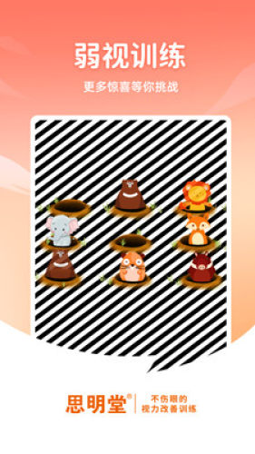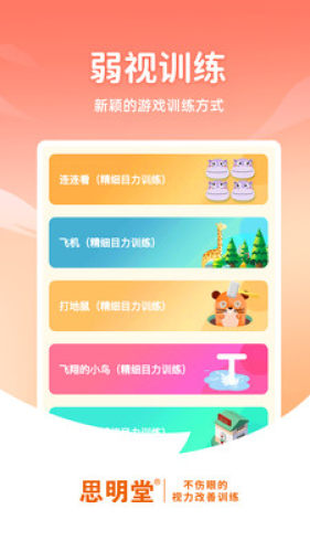 思明堂弱视训练(APP)是基于线下直营门店的成熟临床训练经验,并结合儿童心理学、视光学的相关知识研发而成。 一、软件功能介绍 方案匹配与购买: 用户通过填写视力数据、上传视力检查报告,匹配相应的视力训练方案,自主选择是否购买; 二、软件特性介绍 思明堂弱视训练软件通过个专属步骤进行训练,其中目力训练是基于色彩冲击、动态切换等要素,形成四个不同的游戏,寓训练于乐,锻炼儿童视物的敏锐度、清晰度及立体视觉;远视量化训练通过快速量化引导家长与孩子进行互动,避免枯燥,调动孩子积极性。整个训练过程在专业、科学的同时,又不失轻松、愉快,努力达到“要孩子训练”向“孩子要训练”效果,实现“快乐康复”。